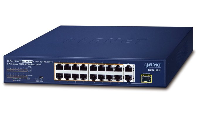 Porty: 16x 10/100 Base-TX RJ-45, 2x 10/100/1000 Base-T RJ-45, 1x SFP 1000 Base-SX/LX/BX
