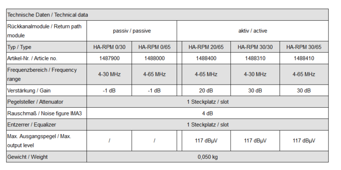 Zpětný kanálový modul pro HA zesilovače 0 dB, 65 MHz
