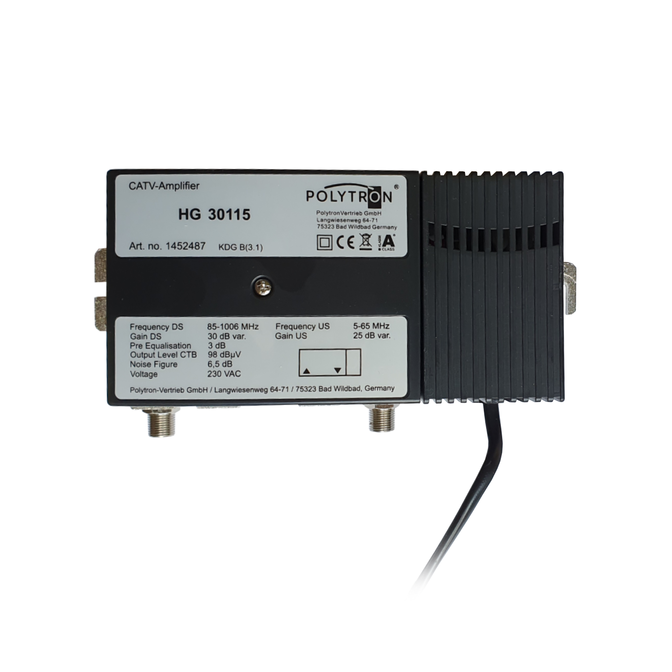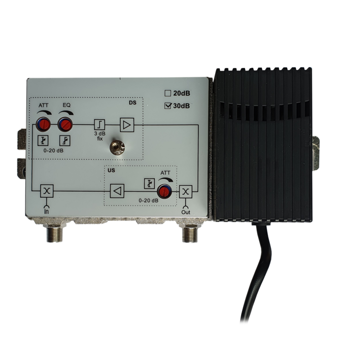 1 GHz domovní zesilovač, 30 dB, 115 dBµV, zpětný směr 25 dB, 5- 65 MHz