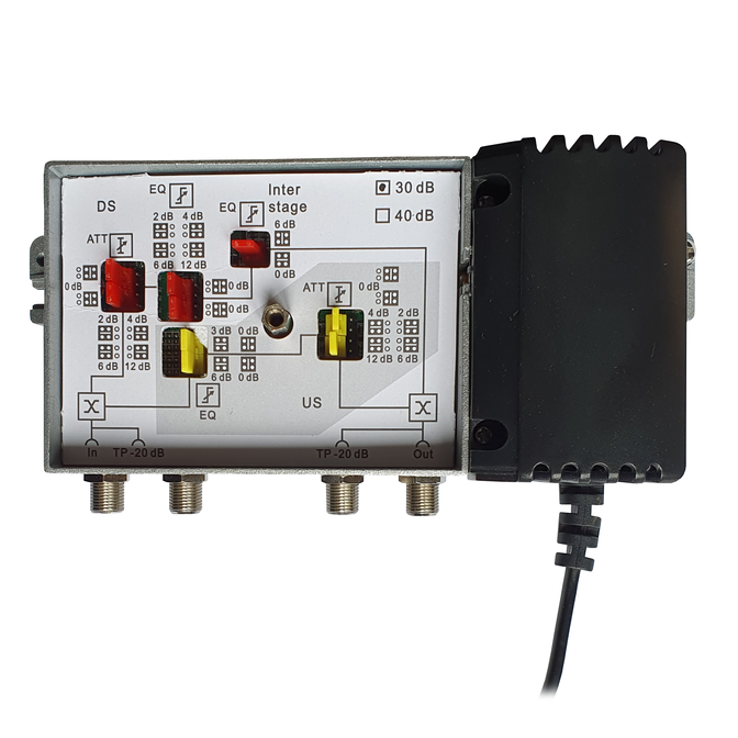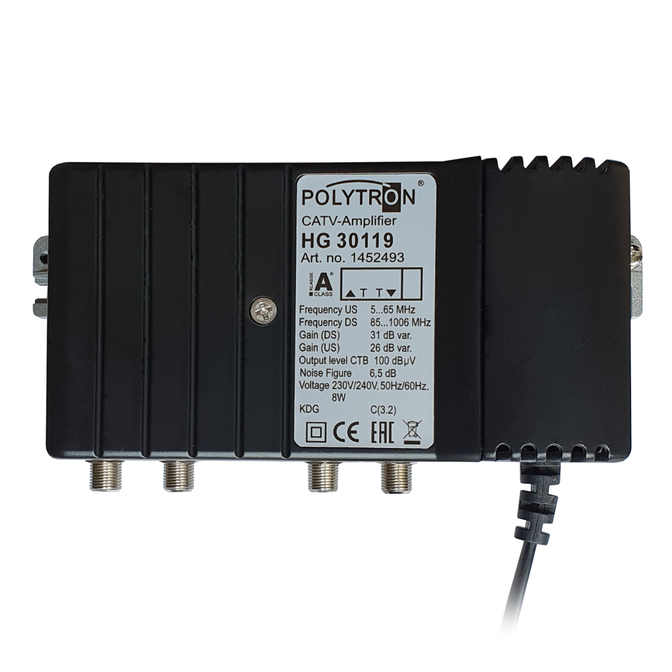1 GHz domovní zesilovač, 31 dB, 119 dBµV, zpětný směr 26 dB, 5- 65 MHz
