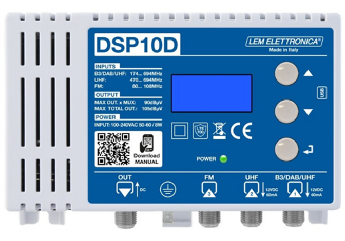 DSP10-D je kompaktní programovatelný zesilovač pro příjem digitální pozemské televize DVB-T a DVB-T2. Díky vynikajícímu poměru ceny a výkonu je ideální volbou pro menší instalace – od rodinných domů po malé bytové domy. Disponuje třemi vstupy pokrývajícími pásma FM, BIII/DAB a UHF s integrovanou ochranou proti rušení LTE700/4G/5G.
