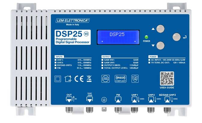 DSP25 V2 je kompaktní programovatelný zesilovač s digitálním zpracováním kanálů DVB-T a DVB-T2, navržený s důrazem na vynikající poměr ceny a výkonu. Je ideální volbou pro široké spektrum aplikací – od anténních rozvodů v rodinných domech až po menší bytové domy. Disponuje čtyřmi vstupy pokrývajícími pásma FM, BIII/DAB a UHF s integrovanou ochranou proti rušení LTE700/4G/5G.