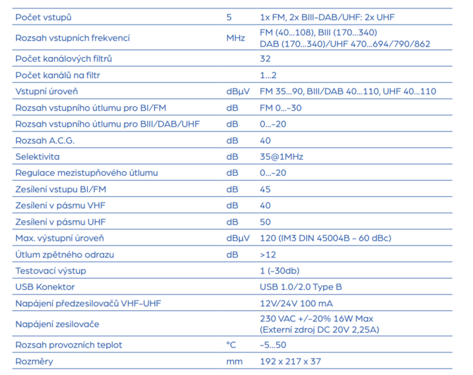 | rozsah vstupních frekvencí: | FM (40..108), BIII (170..340)/DAB (170..340), UHF (470..694/790/862) |