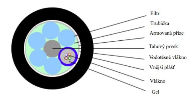 Optický kabel obsahuje optická (skleněná) vlákna, která zajišťují rychlý přenos paprsku z bodu A do bodu B s co nejnižší ztrátou.