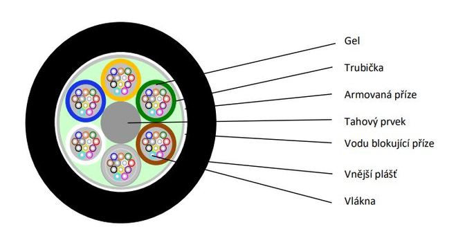 Optický kabel obsahuje optická (skleněná) vlákna, která zajišťují rychlý přenos paprsku z bodu A do bodu B s co nejnižší ztrátou.