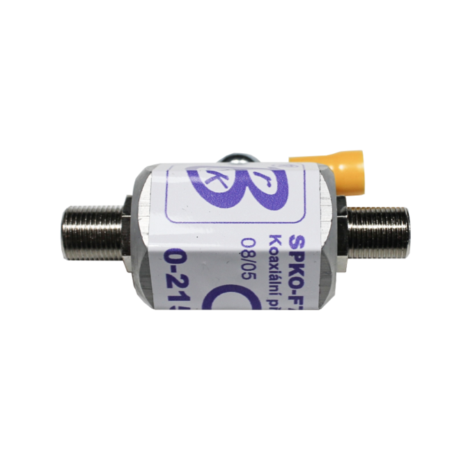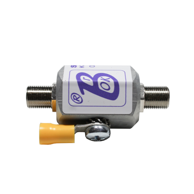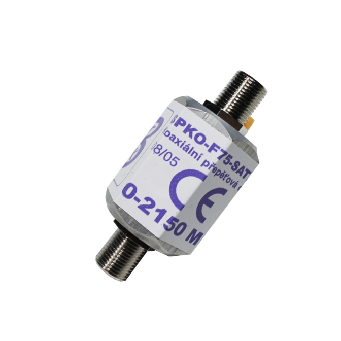 Přepěťová ochrana BrOK® SPKO-F75-SAT/TV-B/F-F, typ 1 (svodič bleskového proudu třídy B). Je osazena plynovou bleskojistkou a je určena k ochraně citlivých vstupů anténních zesilovačů STA, SAT konvertorů a TV přijímačů připojených koaxiálním kabelem 75 Ohm vedoucím od TV a SAT antén z venkovního prostředí (LPZ 0B,C). Ochrana se připojuje ke chráněnému koaxiálnímu kabelu jako průchozí kabelová spojka F-F s konektory typu F75.