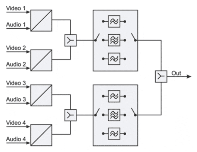 Modulátor Quattro přenáší 4 AV signály současně do volně programovatelných výstupních kanálů.