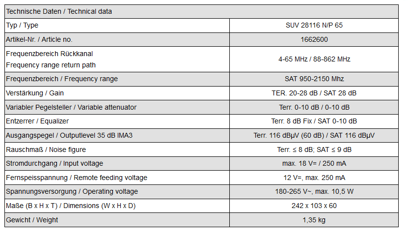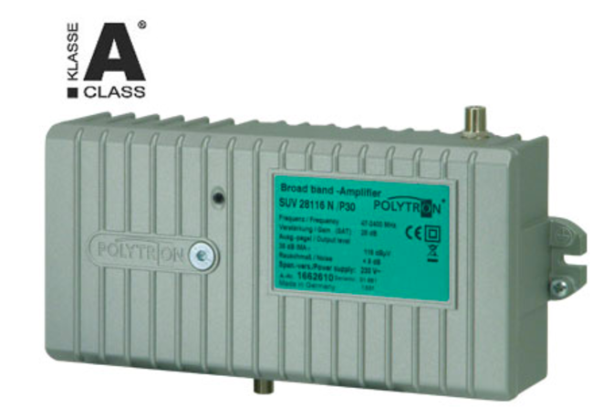 Zesilovač s rozděleným pásmem, 47-2300 MHz, 28 dB, zpětný směr 65 MHz