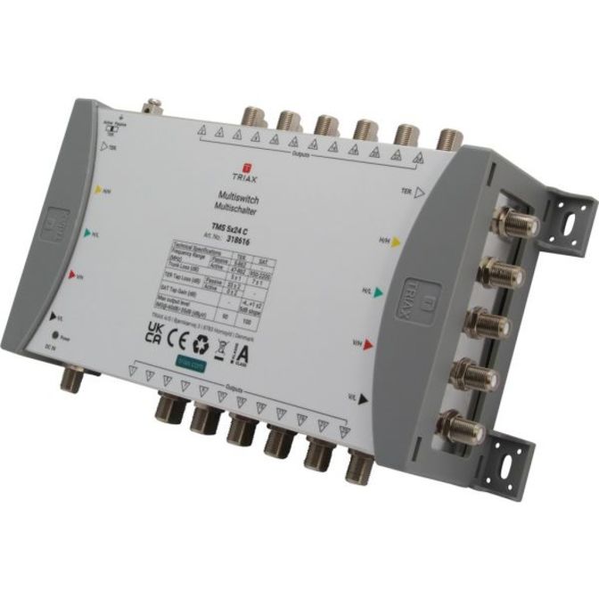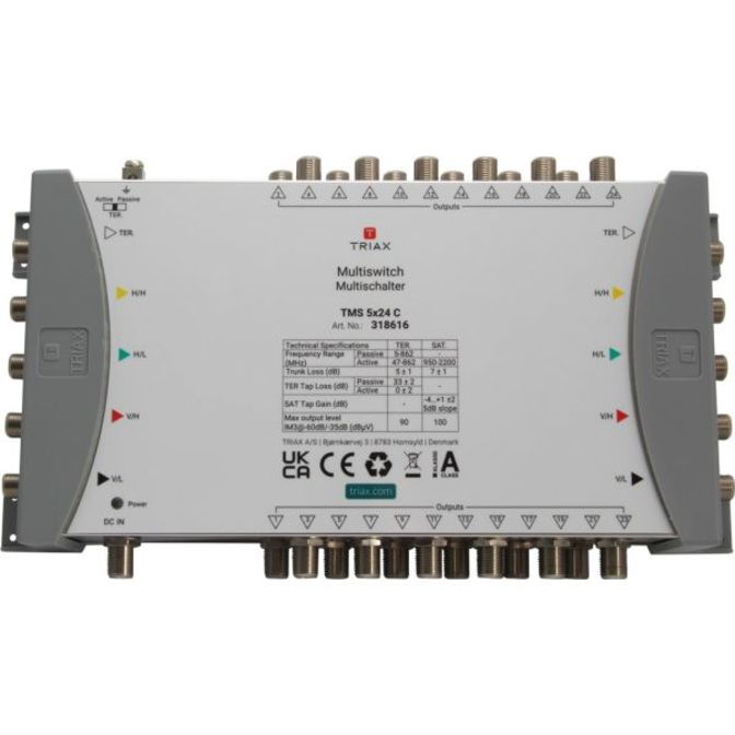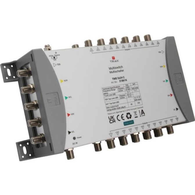 Kaskádový multipřepínač pro 1 satelitní pozici s 5 vstupy a 5 hlavními výstupy, vhodný pro distribuci satelitních a pozemních signálů v malých až velkých systémech.