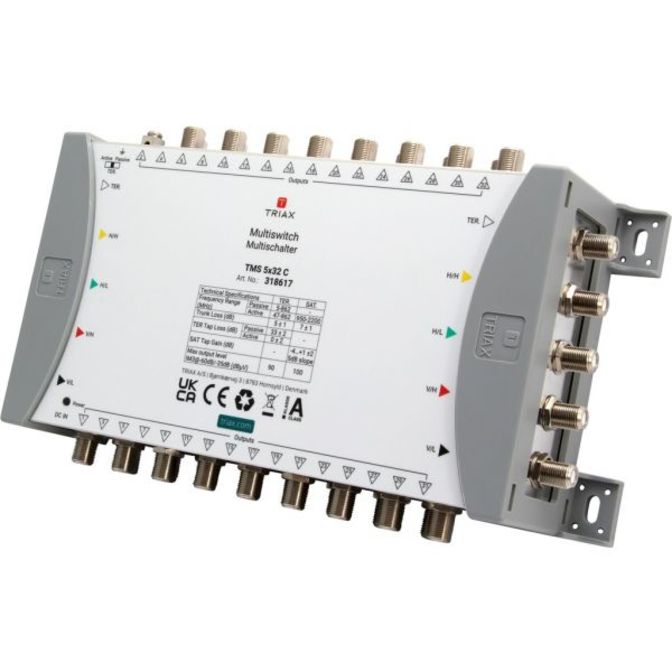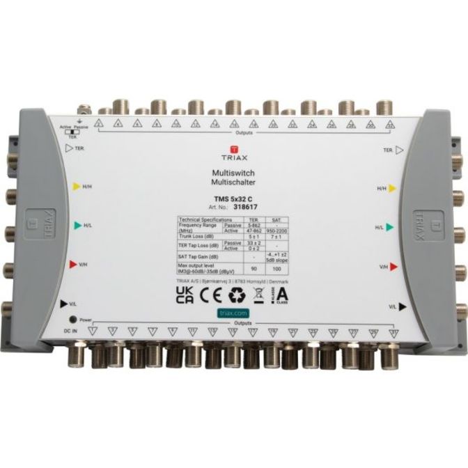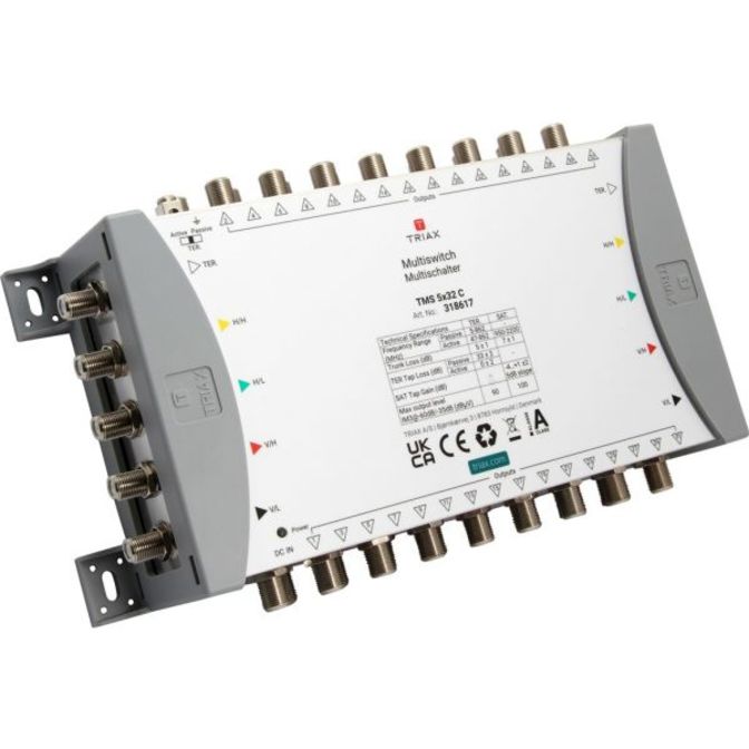 Kaskádový multipřepínač pro 1 satelitní pozici s 5 vstupy a 5 hlavními výstupy, vhodný pro distribuci satelitních a pozemních signálů v malých až velkých systémech.