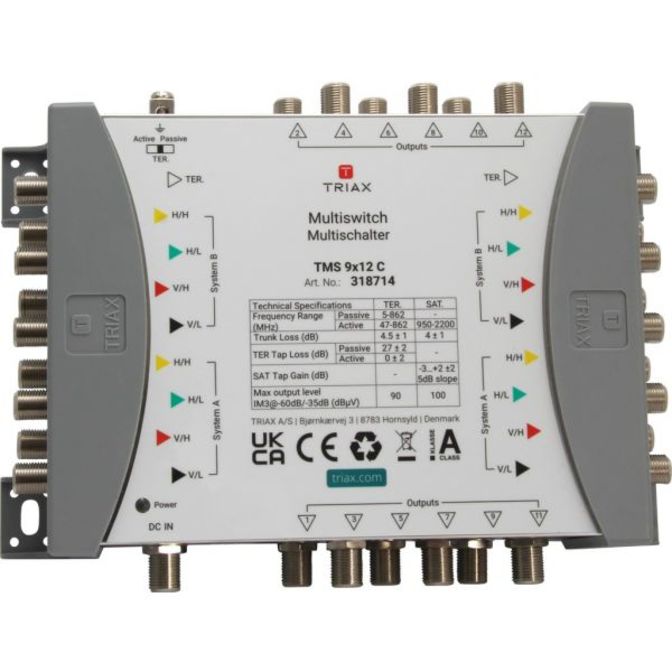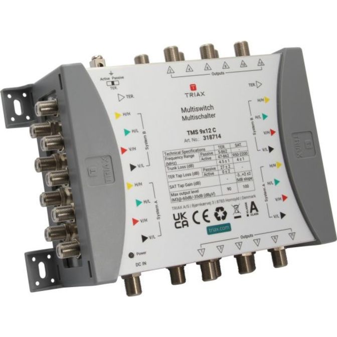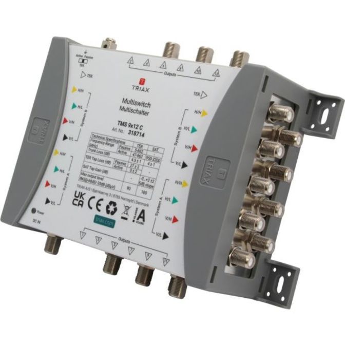 Kaskádový multipřepínač pro 2 satelitní pozice s 9 vstupy a 9 hlavními výstupy, vhodný pro distribuci satelitních a pozemních signálů v malých až velkých systémech.