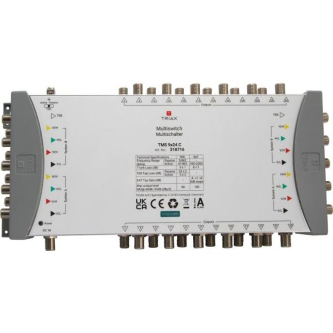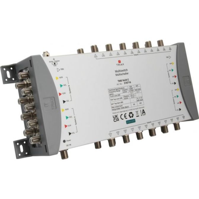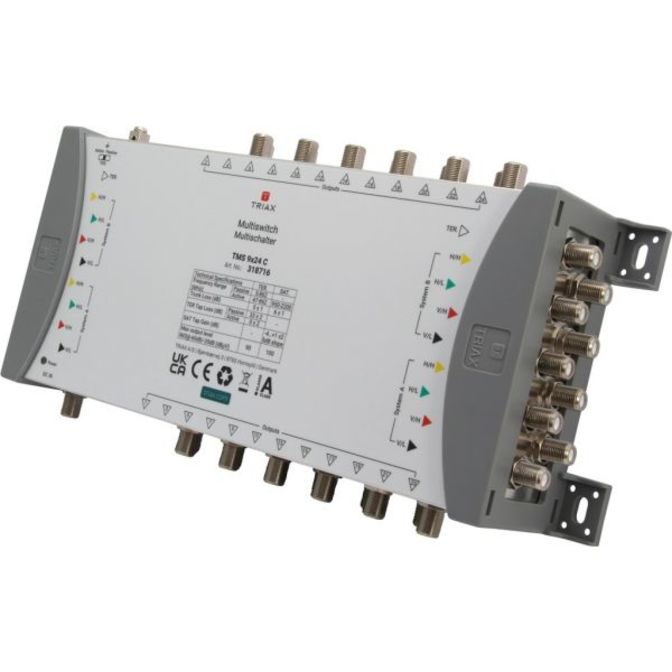 Kaskádový multipřepínač pro 2 satelitní pozice s 9 vstupy a 9 hlavními výstupy, vhodný pro distribuci satelitních a pozemních signálů v malých až velkých systémech.