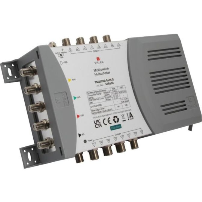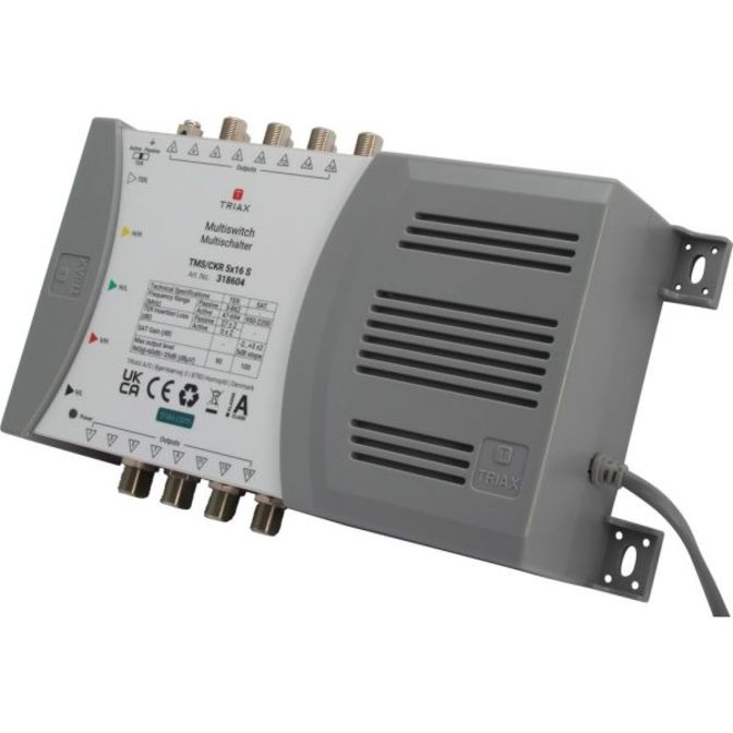 Samostatný multipřepínač pro 1 satelitní pozici s 5 vstupy a 16 výstupy, vhodný pro distribuci satelitních a pozemních signálů v malých a středně velkých systémech.