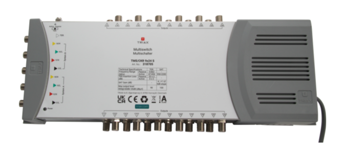 Samostatný multipřepínač pro 1 satelitní pozici s 5 vstupy a 24 výstupy, vhodný pro distribuci satelitních a pozemních signálů v malých a středně velkých systémech.