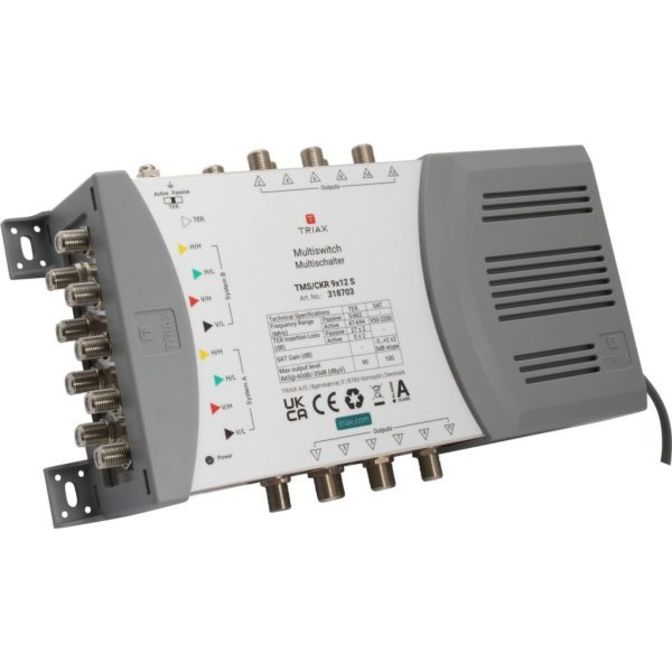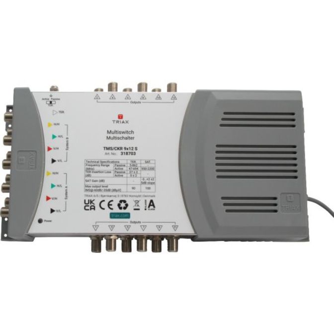 Samostatný multipřepínač pro 2 satelitní pozice s 9 vstupy a 12 výstupy, vhodný pro distribuci satelitních a pozemních signálů v malých a středně velkých systémech.