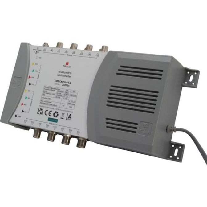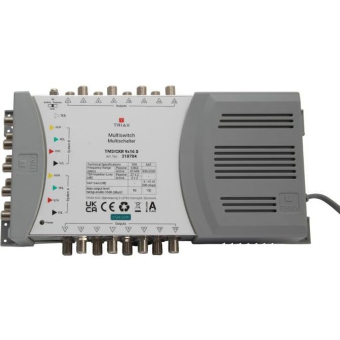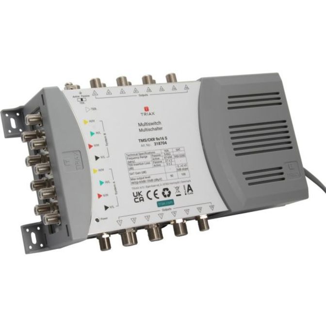 Samostatný multipřepínač pro 2 satelitní pozice s 9 vstupy a 16 výstupy, vhodný pro distribuci satelitních a pozemních signálů v malých a středně velkých systémech.