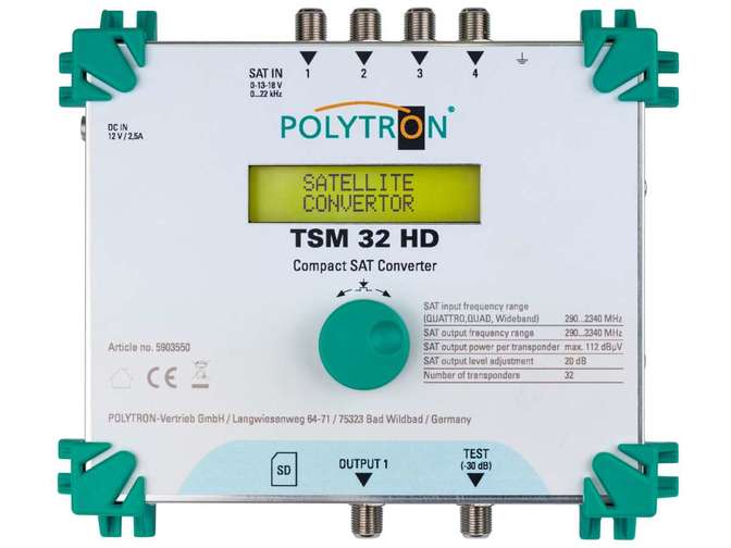 K SAT vstupům lze připojit Quattro, quad nebo wideband LNB. TSM 32 HD převádí libovolných 32 transpondérů DVB-S nebo DVB-S2 (QPSK / 8PSK) na libovolných 32 výstupních frekvencí. Rozsah výstupního kmitočtu je individuálně nastavitelný od 290 do 2340 MHz.