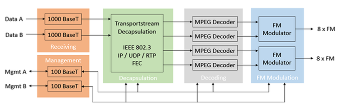 for processing of up to 4 IP multicast groups of a Gigabit Ethernet MPEG TS into 2 x 8 standard FM channels