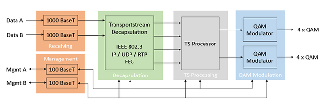 for processing of up to 8 IP multicast groups of a Gigabit Ethernet MPEG TS in 8 standard QAM channels